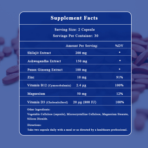 This Shilajit nutritional supplement is formulated to enhance energy levels, support immune function, and promote overall well-being. Shilajit is known for its rejuvenating properties and rich mineral content. The addition of Ashwagandha and Panax Ginseng further supports stress reduction and vitality. Zinc, Magnesium, Vitamin B12, and Vitamin D3 contribute to metabolic function, bone health, and immune support.