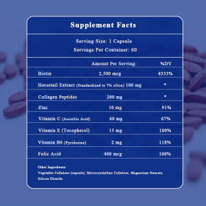 This Biotin nutritional supplement is designed to support healthy hair, skin, and nails, enhance overall beauty, and promote metabolic health. Biotin is essential for keratin production, which improves the strength and appearance of hair and nails. Horsetail Extract provides silica, which supports collagen production and skin health. Collagen Peptides and Vitamin C work together to promote skin elasticity and reduce signs of aging. Zinc, Vitamin E, Vitamin B6, and Folic Acid support overall metabolic function and enhance the effectiveness of Biotin.