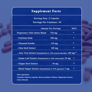 This Fiber Detox Cleanse nutritional supplement is designed to support digestive health, enhance detoxification, and promote regular bowel movements. Psyllium Husk, Flaxseed Powder, and Chia Seed Extract provide soluble and insoluble fiber to help cleanse the digestive tract and support bowel regularity. Aloe Vera Extract, standardized to 10% polysaccharides, soothes the digestive system and promotes gentle detoxification. Senna Leaf Extract, standardized to 20% sennosides, acts as a natural laxative to relieve occasional constipation. Ginger Root Extract helps to reduce bloating and support digestion. Black Pepper Extract improves the absorption of active ingredients.