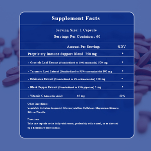 This Graviola nutritional supplement is designed to support immune function, enhance antioxidant activity, and promote overall well-being. Graviola Leaf Extract, standardized to 10% annonacin, is known for its immune-boosting properties and potential anti-inflammatory effects. Turmeric Root Extract provides powerful antioxidant and anti-inflammatory benefits. Echinacea Extract supports the immune system and helps fight infections. Black Pepper Extract improves the absorption of active ingredients, while Vitamin C provides additional immune support and antioxidant protection.