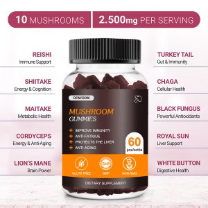 These mushroom gummies blend 10 potent functional mushrooms, including Reishi, Turkey Tail, Shiitake, Chaga, Cordyceps, and Lion’s Mane, to support overall wellness. Formulated with 2,500mg of mushroom extracts per serving, they are designed to enhance immune function, promote gut health, and provide natural energy. Reishi and Turkey Tail contribute to immune defense, while Chaga and Cordyceps help combat fatigue and support cellular health. Lion’s Mane is included for cognitive benefits, and Maitake aids metabolic balance. The gummies are gluten free, non GMO, and made in GMP certified facilities, ensuring quality and safety. Ideal for daily use, they offer a convenient way to harness the antioxidant and adaptogenic properties of mushrooms for sustained vitality.