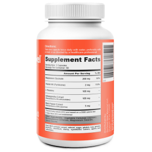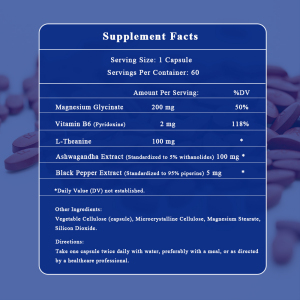 This Magnesium Glycinate nutritional supplement is designed to support muscle relaxation, improve sleep quality, and promote overall well-being. Magnesium Glycinate is a highly bioavailable form of magnesium that helps to support muscle and nerve function while promoting relaxation. Vitamin B6 enhances magnesium absorption and utilization. L-Theanine and Ashwagandha Extract help reduce stress and improve mental clarity. Black Pepper Extract improves the absorption of active ingredients.