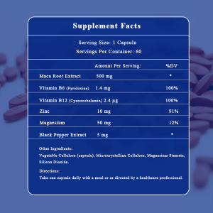 This Maca nutritional supplement is designed to enhance energy levels, support hormonal balance, and boost overall vitality. Maca root is known for its adaptogenic properties, helping the body adapt to stress and improve endurance. The addition of Vitamin B6, B12, Zinc, Magnesium, and Black Pepper Extract enhances absorption and provides comprehensive support for metabolic and immune functions.