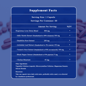 This Milk Thistle Liver Detox nutritional supplement is designed to support liver health, enhance detoxification, and promote overall well-being. Milk Thistle Extract, standardized to 80% silymarin, is known for its liver-protective properties and ability to support liver function. Dandelion Root and Artichoke Leaf Extracts further enhance liver detoxification and support digestive health. Turmeric Root Extract provides powerful anti-inflammatory and antioxidant benefits. Black Pepper Extract improves the absorption of active ingredients. Choline supports liver function and fat metabolism.