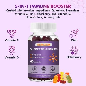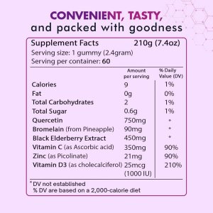 These Quercetin Gummies are a delicious and convenient way to support your immune system daily. Packed with science backed ingredients like quercetin (750mg), black elderberry extract (450mg), and a powerful blend of vitamin C (350mg), zinc (21mg), and vitamin D3 (25mcg), they help fortify your natural defenses. Quercetin, a potent antioxidant, works synergistically with bromelain (90mg from pineapple) to promote healthy inflammation response, while elderberry provides additional immune boosting properties. With only 9 calories per gummy and no added sugars, they’re a guilt free supplement that fits seamlessly into your wellness routine.