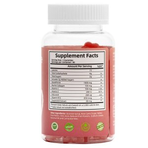 These Glutathione Gummies combine 1000mg of glutathione with marine collagen, vitamins C and E, and grapeseed extract to support skin health and immune function. Glutathione, a powerful antioxidant, may help combat oxidative stress and promote a radiant complexion. Marine collagen contributes to skin elasticity, while vitamins C (110% DV) and E (667% DV) further enhance antioxidant protection and collagen synthesis. Folic acid and vitamin B12 support energy metabolism. The gummies are vegan friendly, made with natural ingredients like coconut oil, and free from artificial additives. *Note: These statements are based on the nutritional profile of the ingredients. Individual results may vary. Consult a healthcare professional before use.*