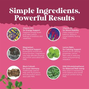 PMS Gummies are crafted with a blend of science backed ingredients to help women navigate the challenges of PMS naturally. Vitamin B12 supports energy levels, reducing feelings of tiredness, while Vitamin B6 promotes mood stability during hormonal fluctuations. Magnesium contributes to muscle and nerve function, easing physical discomfort. Lemon Balm offers calming support to reduce stress, and Black Cohosh helps maintain inner harmony. DIM (Diindolylmethane) aids in balanced well being for overall comfort. These gummies are designed to provide gentle, holistic support—helping you feel more like yourself during PMS.
